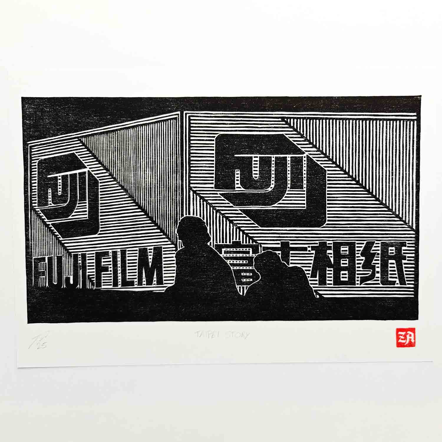 A woodcut print of the iconic FujiFilm billboard scene from Edward Yang's Taipei Story (1985).